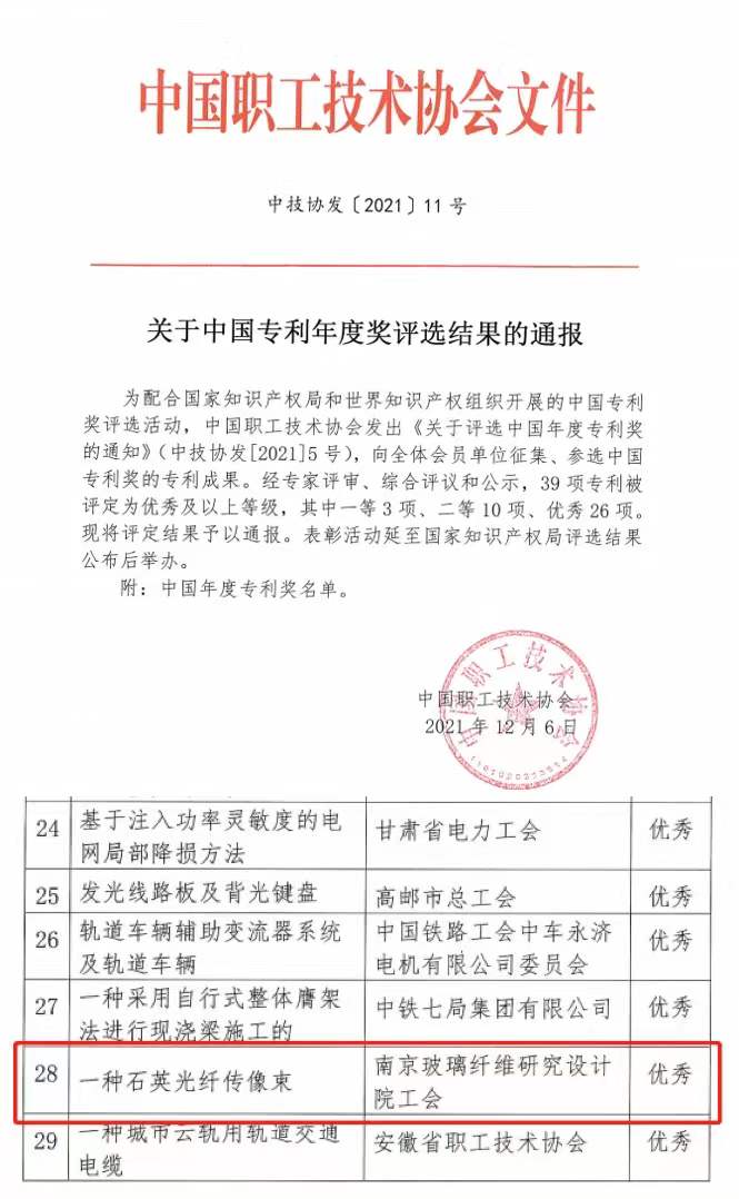 2021年12月6日,中國(guó)職工技術(shù)協(xié)會(huì)公布首屆中國(guó)專(zhuān)利年度獎(jiǎng)評(píng)選結(jié)果,南京春輝科技實(shí)業(yè)有限公司參選的“一種石英光纖傳像束”專(zhuān)利榮獲中國(guó)專(zhuān)利年度獎(jiǎng)——優(yōu)秀獎(jiǎng)。在本次中國(guó)專(zhuān)利年度獎(jiǎng)評(píng)選中,經(jīng)專(zhuān)家評(píng)審、綜合評(píng)議和公示,共有39項(xiàng)專(zhuān)利被評(píng)定為優(yōu)秀及以上等級(jí),其中江蘇省范圍參選專(zhuān)利有9項(xiàng)獲獎(jiǎng)。