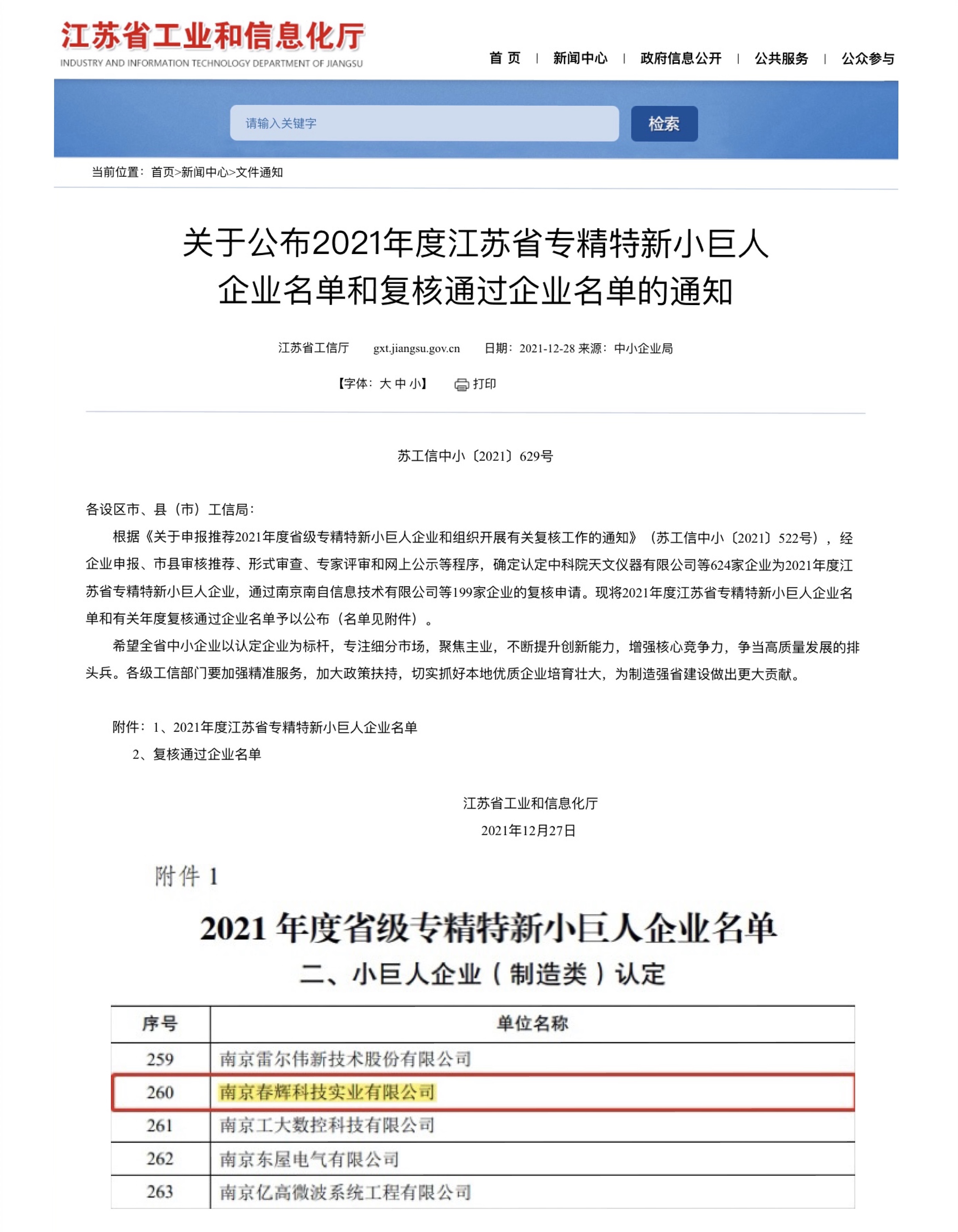 2021年12月27日,江蘇省工業(yè)和信息化廳發(fā)布《關(guān)于公布2021年度省專(zhuān)精特新小巨人企業(yè)名單和復(fù)核通過(guò)企業(yè)名單的通知》,其中南京市僅認(rèn)定了62家,南京春輝科技實(shí)業(yè)有限公司脫穎而出,被認(rèn)定為江蘇省專(zhuān)精特新“小巨人”企業(yè)。